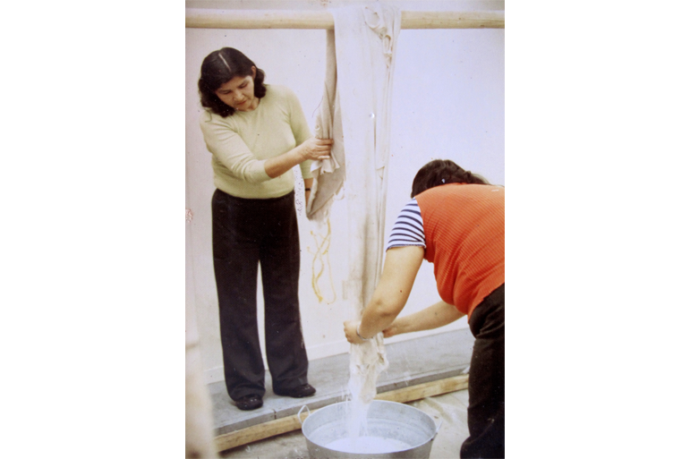 Au printemps ou à l’été, on rince la peau et on la suspend sur la perche pour battre et étirer le cuir de tous les côtés jusqu’à ce qu’il sèche. Le procédé peut prendre une journée ou moins en fonction de la température.